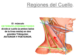 Para la evaluación del cuello lo dividiremos en 2 triángulos, tomando como referencia el Músculo esternocleidomastoideo. Entonces tendremos un triángulo posterior y un triángulo anterior. De arriba hacia abajo se divide en tres.